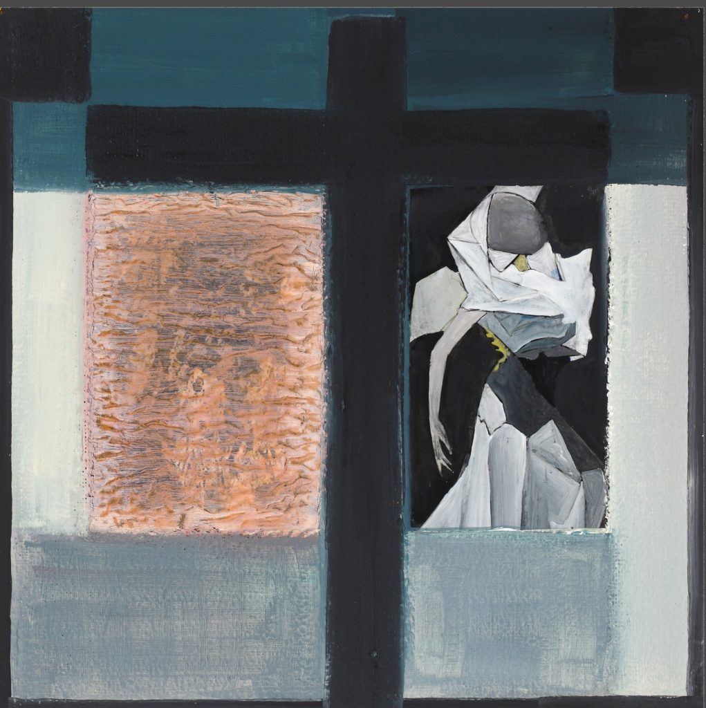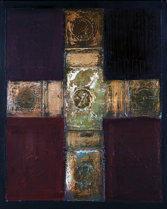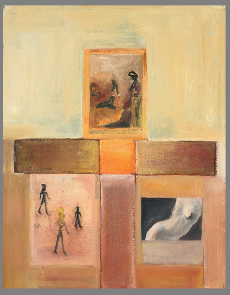 Dans ses toiles, les plans glissent, faussement immobiles, puis la géométrie des formes se nimbe de mystères, lorsque apparaît le visage ou le corps, d’une présence humaine de moins en moins fugitive, au milieu d’un labyrinthe de carrés et de rectangles. D’étranges croix jalonnent sa route picturale. Tel Fernando Pessoa, Jame Saurel est habité par « l’intranquillité » de l’être. Il n’erre pas dans les dédales de la ville blanche mais dans sa mémoire et il convoque en permanence ceux qu’il a aimés et qui ont disparu. Et Lisbonne n’est pas si loin d’Alger. Cette musique le nargue et chuchote : « sois sage, ô ma douleur » ; alors il invoque ses dieux de la peinture, Nicolas de Stael, Poliakoff et Soulages, qui descendent de l’Olympe pour lui ap- prendre à cheminer, avec la perfection en ligne de mire.
