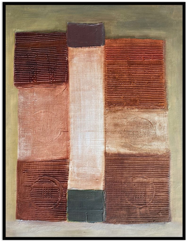 La matière, couture de l’âme, cisèle le temps et, manière ineffable, cicatrise tout. Jame Saurel se soigne lui-même avant les autres. Il lui faut partir sans cesse à la recherche de cette fenêtre ouverte sur sa vie en devenir, symbolisée par les carrés qui flottent dans ses compositions. Depuis son enfance, il doit affronter la maladie et la mort, à laquelle il est confronté très tôt.